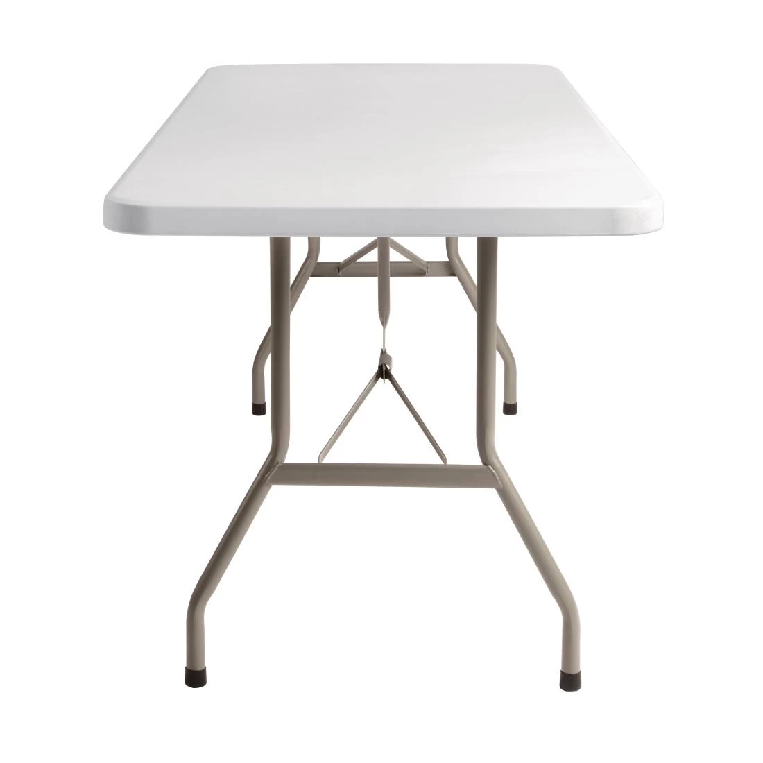 Upgrade your furniture collection with a tough and practical addition, with the 6ft, white rectangular folding table from Bolero. Thanks to an easy-to-use design, all that’s required to get it ready for service is to place it top-down, pull the legs into place, slide the leg pins into position and flip – it’s that simple! This makes it quick to set-up outside of your mobile catering business, or as a back-up table for your overbooked restaurants.