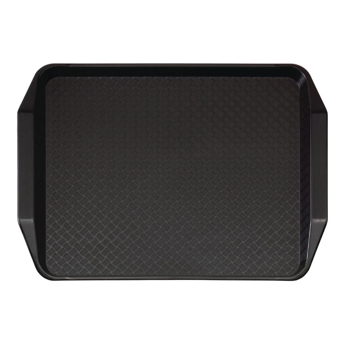 Make it easy for your customers to carry their food and drink using this 430(W) x 300(D)mm black Cambro polypropylene handled fast food tray. With large handles and a textured surface, the tray is secure in the hand and prevents slipping, reducing the risk of costly spills during service. Built from robust polypropylene and boasting reinforced edges, the tray resists flexing when loading with heavy tableware, ensuring optimal safety and stability when your customers are carrying their meals. This polypropylene material also makes the tray incredibly durable, guaranteeing a long life to give you a superb return on your investment. These trays can also be stacked and cleaned in a dishwasher, allowing them to meet the needs of any high-volume venue.