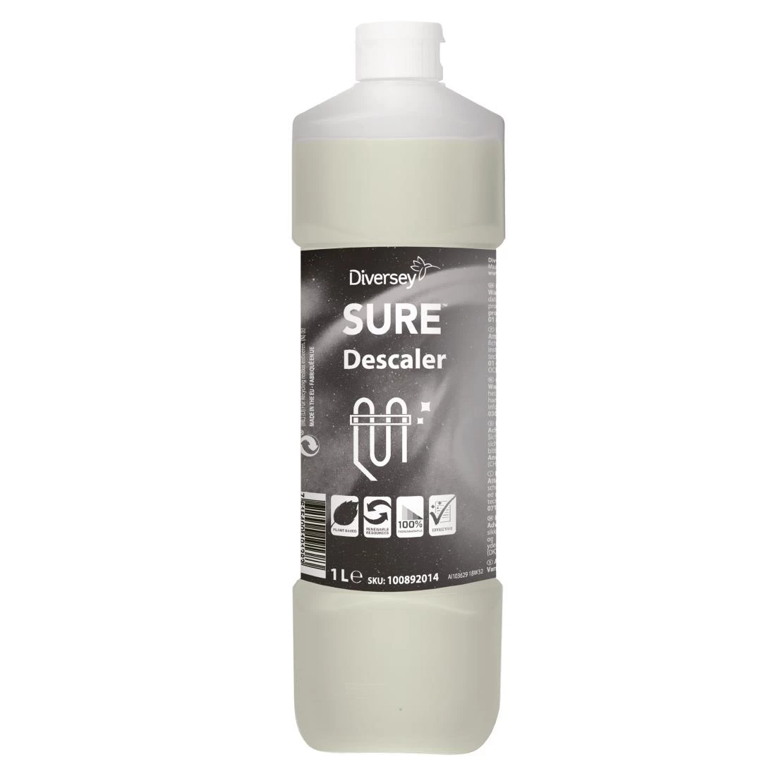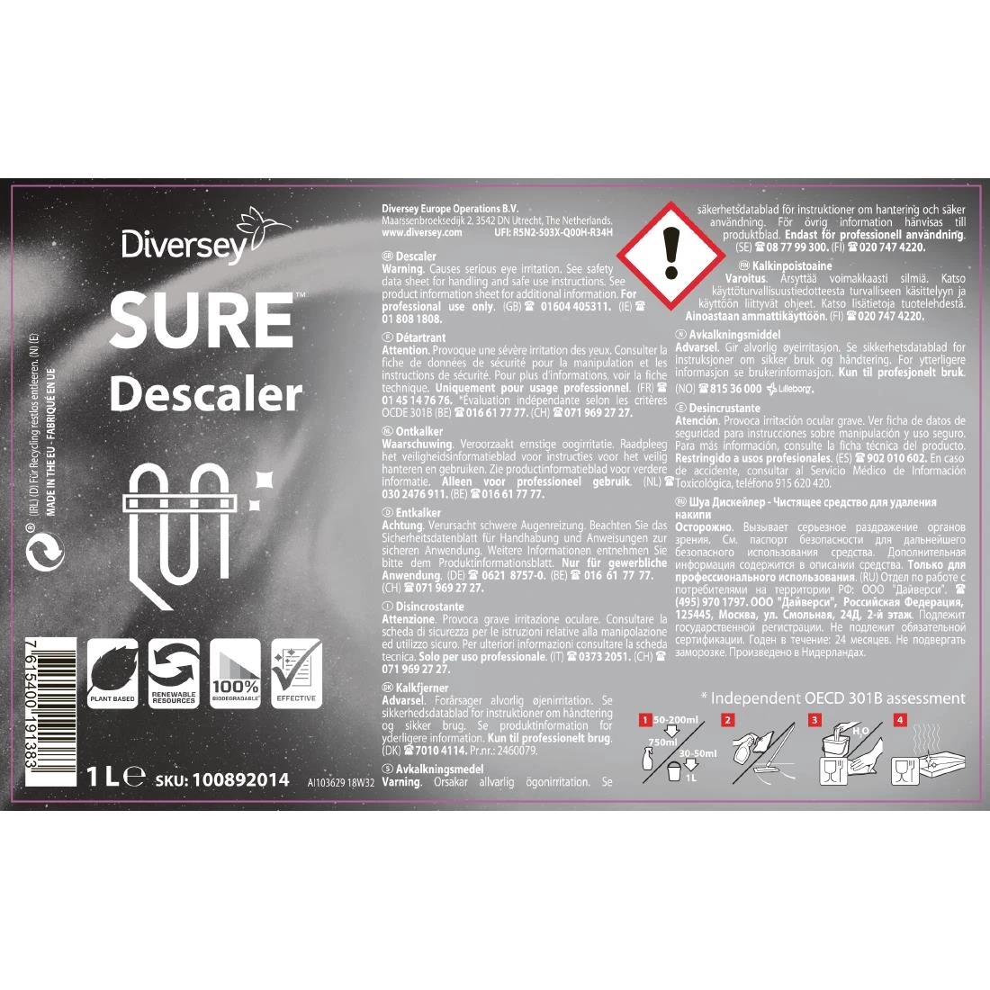 Tackle limescale deposits and take steps towards a more sustainable operation with this 1Ltr Diversey SURE descaler concentrate bottle. As this descaler is made entirely from renewable, plant-based ingredients, it contains no hazardous materials and is fully biodegradable. This means it won’t damage the environment as it breaks down and will ensure your staff are protected against potentially harmful substances when cleaning.