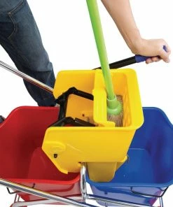 The Jantex dual bucket and mop wringer is a durable polypropylene mopping system, allowing you to use one bucket for clean and one for dirty water, helping you achieve best cleaning results. The mop wringer strains mops of liquid, making cleaning floors more efficient, ideal for use in busy cafes, restaurants, bars and hotels.
