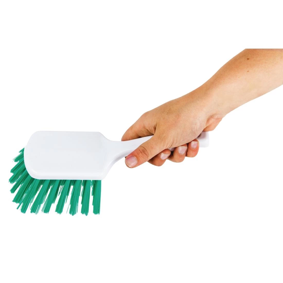 Help keep your kitchen clean with the Jantex Hand Brush in Green. This durable and hygienic brush features a short handle and strong bristles that remove even the toughest of dirt, perfect for saving space and cleaning those hard to reach and small areas. The coloured brush is ideal for areas using a colour coded cleaning system, allowing you to reduce the risk of cross contamination.