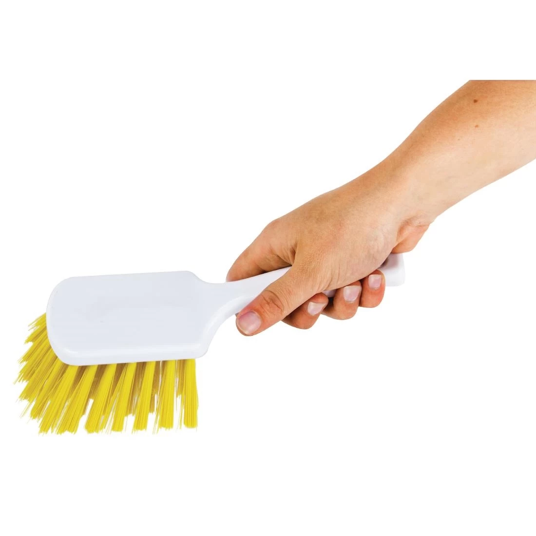 Constructed from durable and hygienic plastic, this yellow hand brush by Jantex is a great item for cleaning in your restaurant or bar. In a handheld design, the tough bristles are long in length, allowing this cleaning accessory the ability to scrub up and remove dirt, spillages and stubborn stains from almost any surface. Great for a busy premises where the surroundings become messy quickly.