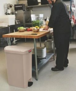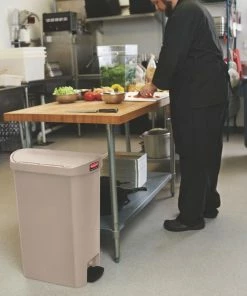 The beige Slim Jim® Step On Container features a commercial grade step on pedal for ease of use, creating a hands free storage unit that will save you time and space. The unit also has a silently closing lid, creating a pleasant environment and atmosphere. This multipurpose container can be used for a variety of tasks from storing items to use as a recycling bin.