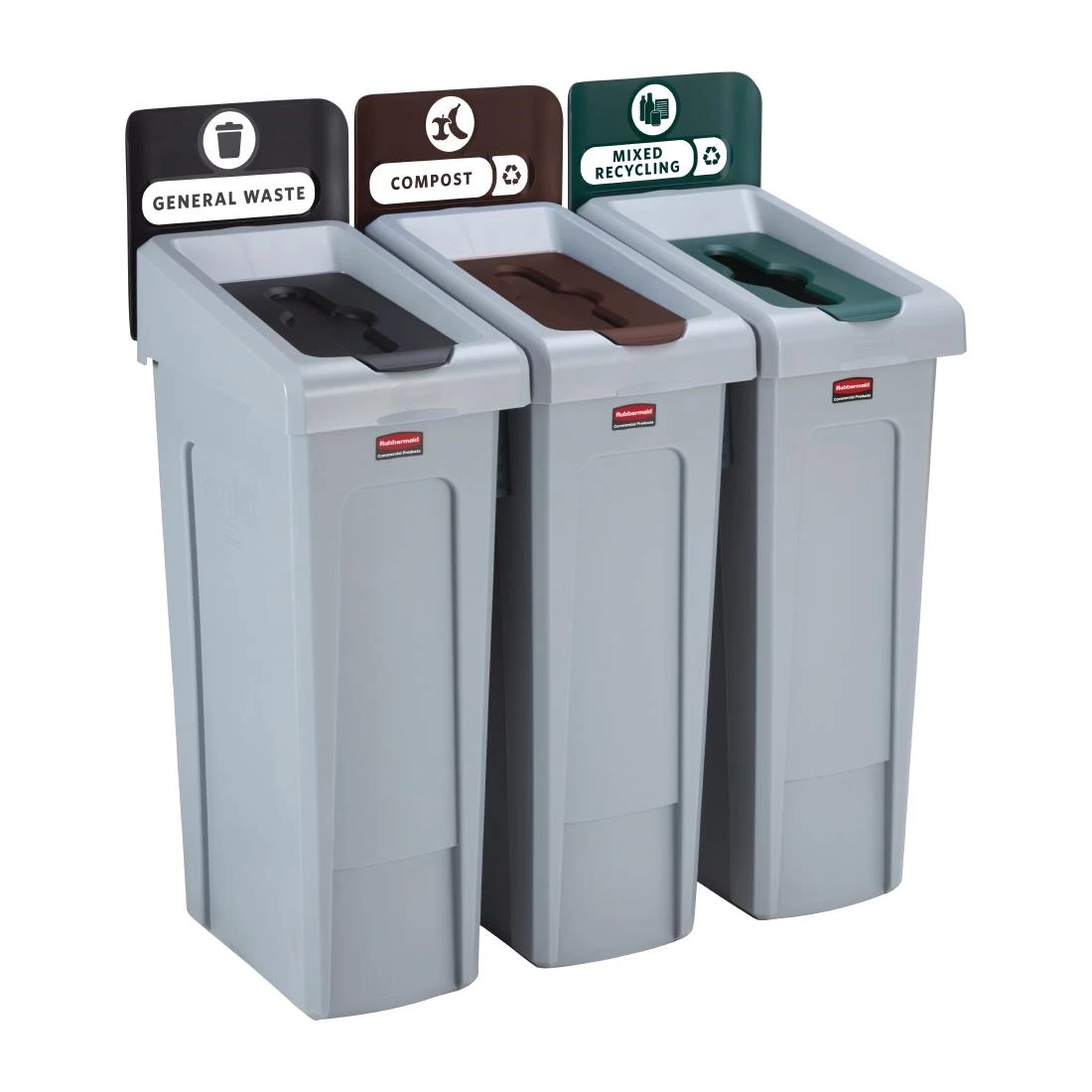 Improve the effectiveness of your recycling process with the 87Ltr Rubbermaid Slim Jim three stream recycling station. Featuring containers for general waste, compost and mixed recycling, this three stream station will help you reduce the amount of waste you send to landfill and divert more materials for recycling. As such, this recycling station works to decrease your business’s environmental impact, improve your sustainability and save you money on landfill costs. Colour-coded and labelled billboards, lid inserts and stickers also make each stream easily identifiable. This will help your staff and customers to correctly segregate their rubbish and prevent the contamination of each waste stream.