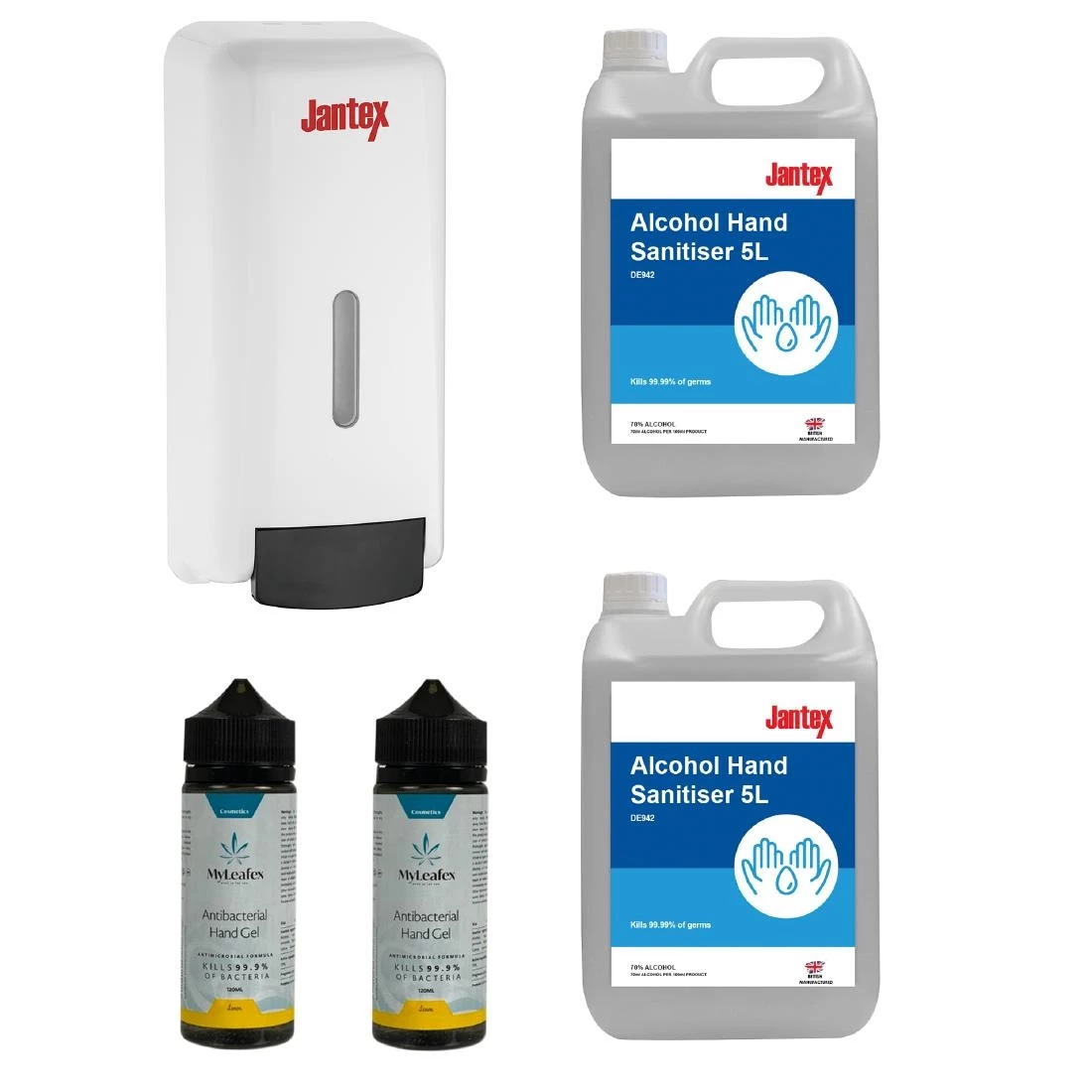 - Contains 1 x 1Ltr Jantex Liquid Soap and Hand Sanitiser Dispenser (FK385), 2 x 120ml 70% ABV Hand Sanitiser Gels (DE699) & 2 x 5Ltr 70% ABV Hand Sanitiser Bottles (DE942)