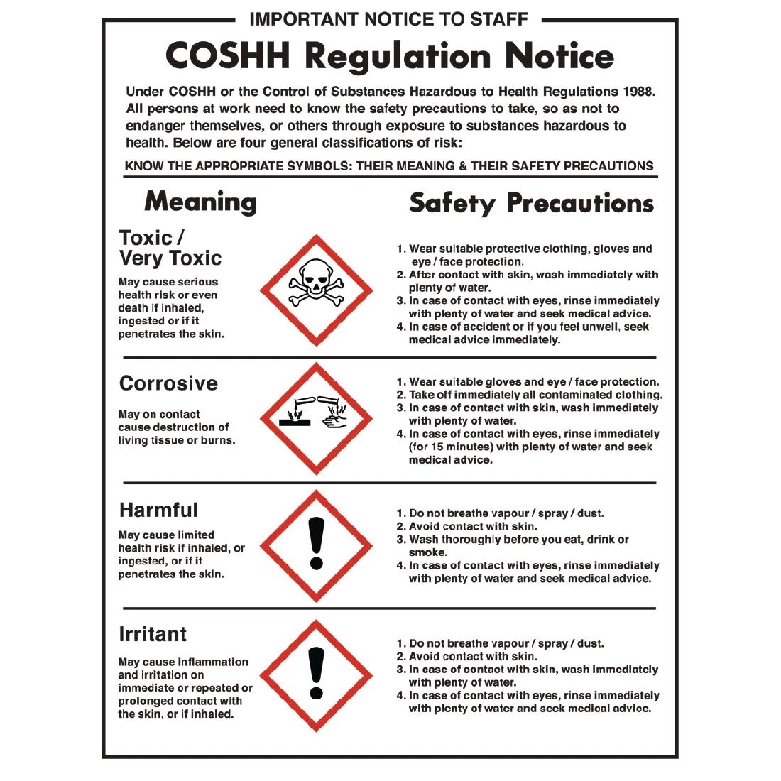 Ensure that health and safety is a priority, with this COSHH Regulation Notice sign. The sign is designed to inform staff members of the symbols used on hazardous substances, such as toxic substances and corrosive chemicals. This aids in reducing the risk of illness or injury within your workplace through providing clear health and safety instructions.