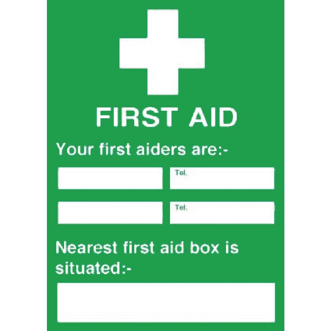 This safety sign displays the names and numbers of first aiders at your workplace and the location of the nearest first aid box, which is critical information required in the event of an emergency. Displaying this information also helps your staff to be aware of who the first aiders are and where the first aid box is stored for future reference and peace of mind.